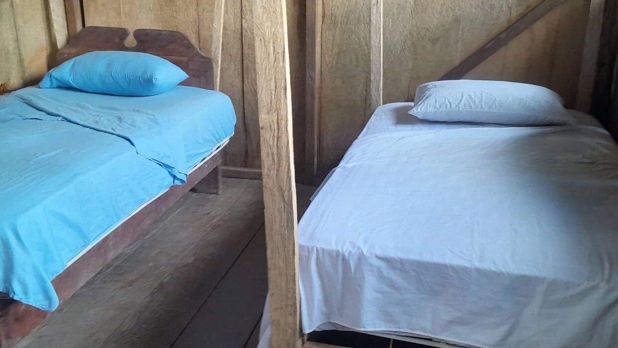 Guest accommodations will depend on the size of your group. During the river journey, you will sleep in a small tent or cabin. In Bameno, we have a basic cabin for guests, with partitions and single beds for eight persons and additional covered space for tents for larger groups. We also have a campsite near Bameno and a shelter in the forest about two hours upriver for guests who want to camp in the rainforest.